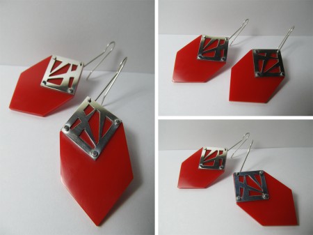 Aros de plata 950 y acrílico rojo. Técnica de calado y remaches. Largo 50 mm.