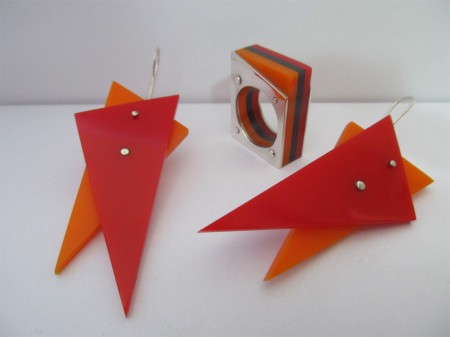 Conjunto de aros y anillo en plata 950 y acrílico en colores. Técnica de remaches.